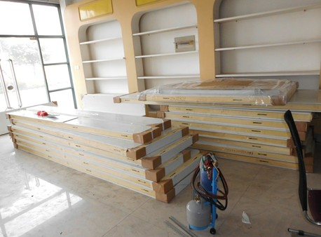 冷庫墻板拼裝完成,準備裝頂板,在裝頂板的同時也是需要先打上發(fā)泡劑,以庫華冷庫的密封性,制冷效果好。